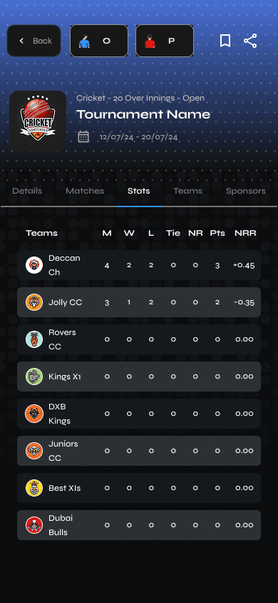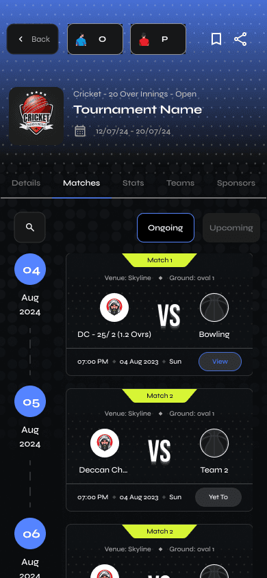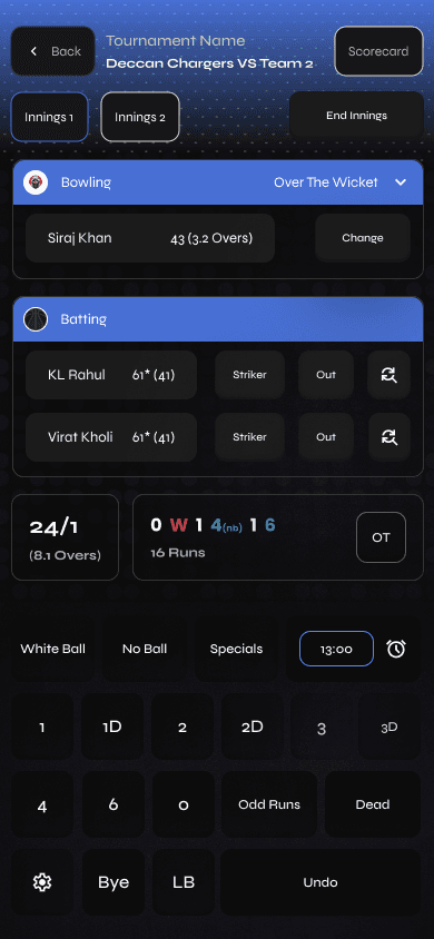 Real-time score updates with intuitive inputs for overs, runs, outs, and other cricket-specific stats, ensuring accurate, up-to-the-minute tracking.